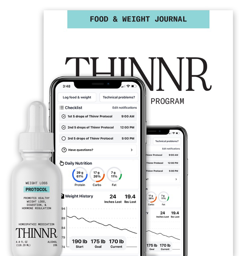 The THINNR homeopathic medication is an all-natural, FDA-registered homeopathic OTC medicine that supports healthy weight loss, a balanced metabolism, lower stress levels, reduced hunger and cravings, detoxification, and improved elimination as part of a comprehensive weight management plan.